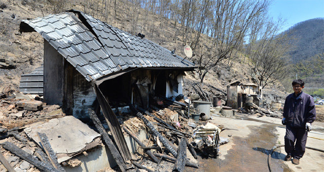산불에 집 잃고 망연자실 26일 오후 경북 안동시 남후면 고하리의 한 농가 앞에서 70대 집주인이 불에