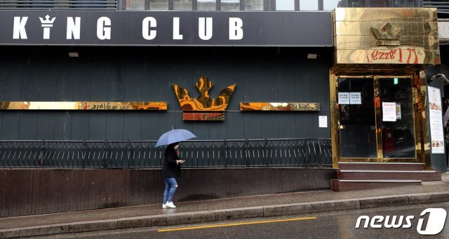 ‘이태원 클럽발’ 신종 코로나바이러스 감염증(코로나19)이 확산되고 있는 15일 오전 코로나19 확진자가 방문 후 폐쇄된 서울 용산구 이태원의 한 클럽 앞으로 한 시민이 지나가고 있다. 2020.5.15/뉴스1 © News1