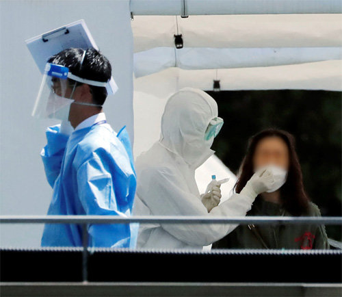 20일 서울 강남구 삼성서울병원 선별진료소에서 방호복을 입은 의료진이 신종 코로나바이러스 감염증(코로나19) 검사를 위해 방문자의 검체를 채취하고 있다. 뉴시스