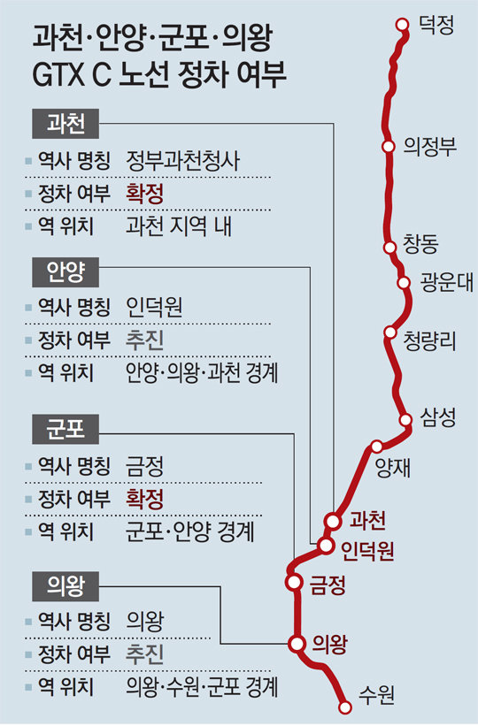 수도권광역급행철도(GTX) C노선(양주∼수원)의 인덕원역과 의왕역 정차 여부를 둘러싸고 인근 주민들이 크게 갈등하고 있다. 안양과 의왕 주민들은 “경제성과 교통 편의성을 고려해 인덕원역과 의왕역에서도 C노선이 정차해야 한다”고 주장했다. 반면 과천과 군포 주민들은 “추가 정차역이 생기면 사실상 완행열차가 된다. 노선 취지를 살려 원안대로 추진해야 한다”고 맞섰다. GTX는 최고 속도가 시속 180km에 달할 정도로 빠르게 운행된다. 고속으로 운행하는 운행 특성상 정차역이 많지는 않다.