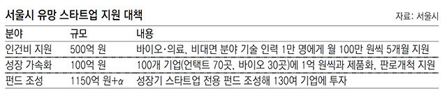 ‘예비 유니콘(기업가치 1000억 원 이상인 업체)’으로 성장할 수 있는 유망 스타트업을 위한 ‘성장촉진 종합 패키지’도 마련됐다. 사업 개발부터 제품화 단계의 연구개발(R&D), 판로 개척, 특허 출원 등에 이르는 사업 전 단계에서 스타트업이 난관에 부딪힐 때마다 적절한 도움을 받을 수 있도록 지원하는 프로그램이다. 시는 민간 벤처캐피털(VC)이나 액셀러레이터 등의 검증을 거쳐 스타트업 100곳을 선발해 기업당 1억 원 상당을 지원한다. 30곳은 바이오·의료 분야 기업을 뽑을 계획이다.