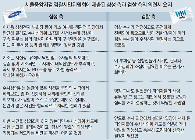 검찰은 이 부회장 등에 대한 구속영장 청구를 기각한 법원의 영장 기각 사유에서 법원이 이 부회장의 기소 필요성을 간접적으로 인정했다는 취지의 주장도 했다. 검찰은 “영장 판사도 밝혔듯이 피의자들의 책임 유무 및 그 정도는 재판 과정에서 충분한 공방과 심리를 거쳐 결정하는 것이 타당한 사안이다”고 강조한 것으로 전해졌다. 검찰은 또 “피의자들이 수사심의위 제도를 악용하거나 남발할 가능성도 충분히 고려하여 (시민위원회의) 신중한 결정이 필요하다”는 의견을 밝혔다. 검찰 수사의 중립성과 객관성을 확보하기 위해 검찰이 자체적으로 마련한 개혁 방안의 하나인 수사심의위는 2018년 1월부터 도입됐지만 약 2년 동안 8건 정도만 열렸다는 것이다.