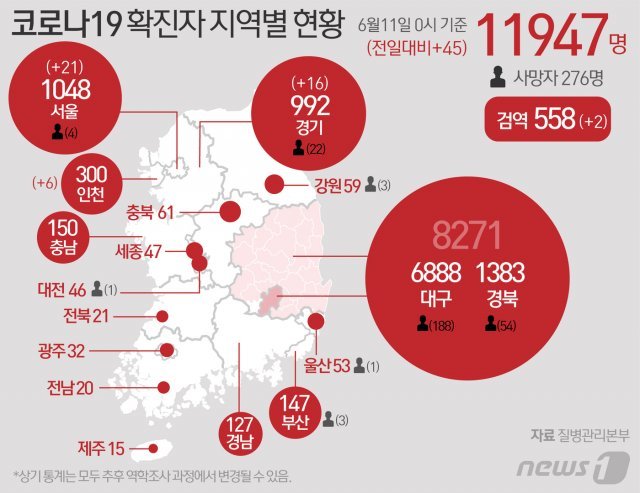 11일 중앙방역대책본부에 따르면 이날 오전 0시 기준 코로나19 신규 확진자는 45명으로 누적 확진자가 1만1947명이 되었다. 신규 확진자 45명의 신고 지역은 서울 21명, 인천 6명, 경기 16명 순이고 검역과정 2명이다. © News1