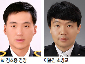 해상동굴에 고립된 다이버 2명을 구조하다 순직한 고 정호종 경장(34)과 터널 속에서 의식을 잃은 운전자의 차량을 몸으로 막아 세운 이윤진 소방교(35)가 LG의인상 수상자로 15일 선정됐다.