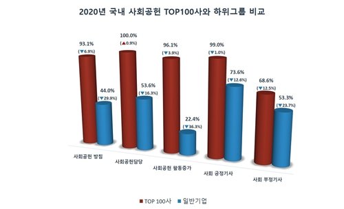 조사결과 사회공헌 전략·시스템을 갖춘 기업의 비중이 TOP 100개 사는 93.1%, 일반기업은 44.0%로서 양 집단 간에 여전히 큰 격차가 있었다. 사회공헌 추진부서 및 담당자의 경우 TOP 100사는 모두 보유하고 있으나 일반기업은 53.6%만 보유하고 있는 것으로 나타났다. 사회공헌활동 증가의 경우, TOP 100사는 96.1%가 전년 대비 활동이 증가했고 일반기업은 22.4%만이 증가했다.