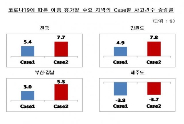 전국의 경우 여름 휴가철 교통사고 건수는 2019년도 31만4667건에서 올해 7.7% 증가한 33만8753건으로 전망됐다. 보수적인 기준을 적용하더라도 5.4% 증가한 33만1555건으로 예상됐다. 이밖에 강원도는 4.9~7.8%, 부산경남은 3.0~5.3% 증가할 것으로 보인다. 제주도의 경우 전체적으로 입도객 수가 전년 대비 큰 폭으로 감소함에 따라 올해 휴가철 사고 건수도 소폭 하락할 것으로 예상됐다.