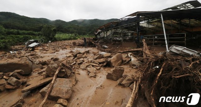 2일 오후 충북 충주시 앙성면 한 축사와 주택이 산사태로 파손돼 있다. 축사에 딸린 주택에서는 산사태로 가스가 폭발하면서 집 주인 A씨(56·여)가 매몰돼 숨졌다. 2020.8.2/뉴스1 © News1