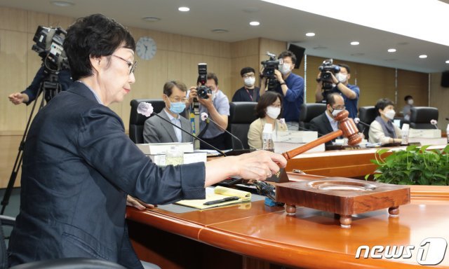 고 박원순 전 서울시장의 성추행 의혹에 대한 국가인권위원회의 직권조사 여부가 결정되는 지난달 30일 오전 서울 중구 국가인권위원회 전원위원회실에서 열린 제26차 상임위원회에서 최영애 인권위원장이 의사봉을 두드리고 있다. 2020.7.30 © News1