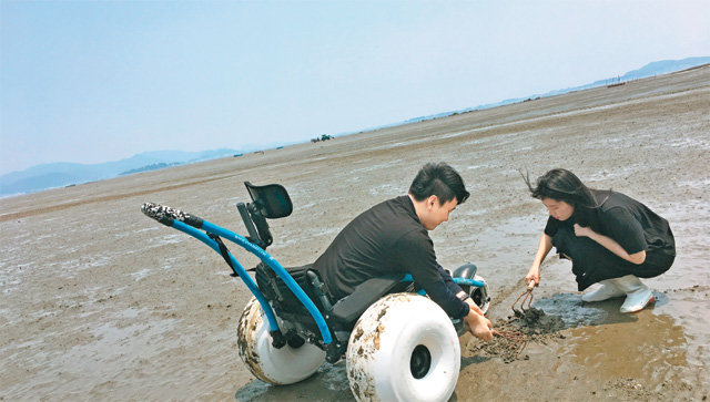 전북 고창군 하전갯벌에서 바다휠체어를 탄 신현오 무빙트립 대표(왼쪽)가 직원과 함께 갯벌을 답사하며 여행 프로그램을 구상하고 있다. 무빙트립 제공