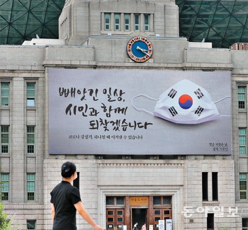13일 오후 서울 중구 서울광장에서 한 시민이 광복절을 앞두고 교체된 서울도서관 글판을 바라보고 있다.