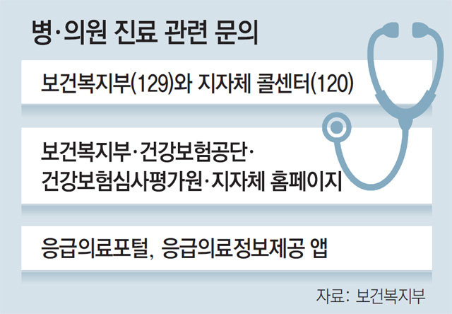 응급 상황이 아니지만 급히 병원에 가야 할 일이 생긴다면 출발하기 전 보건복지부 콜센터(129)에 전화해 문을 연 병·의원을 확인하는 것이 좋다. 복지부, 건강보험공단, 건강보험심사평가원, 각 시도 홈페이지에도 당일 진료를 하는 의료기관이 게시된다. 응급의료포털과 애플리케이션(앱)을 통해서도 응급 진료 상황을 확인할 수 있다.