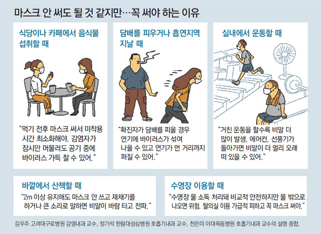 실외에서 2m 이상 떨어져 있다고 해도 이제 마스크 착용은 필수다. 김우주 고려대구로병원 감염내과 교수는 “지금 수도권은 환자가 워낙 많고 감염 경로를 알 수 없는 ‘깜깜이 환자’가 많아 지나가는 누가 감염자일지 알 수 없다. 재채기 등을 통해 나온 비말이 바람을 타고 멀리 날아갈 수도 있다”고 말했다.