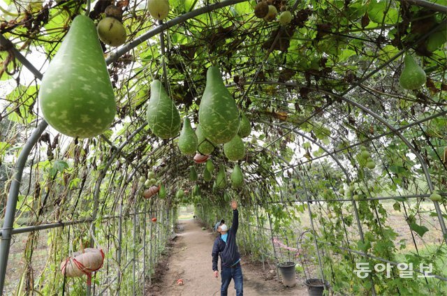 30일 서울 영등포구 양화한강공원의 조롱박 터널에 조롱박이 주렁주렁 열려 시원한 그늘을 만들고 있다.