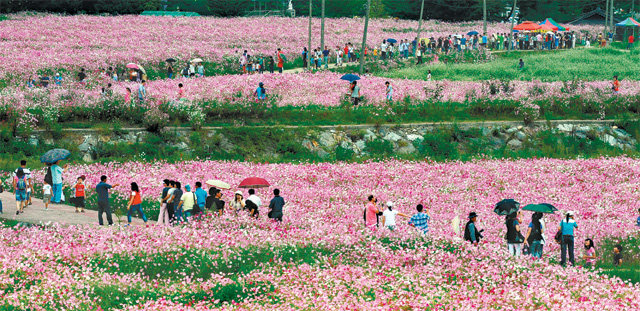 경남 하동군 북천코스모스메밀꽃 영농조합법인이 올해 축제 개최 여부를 놓고 고민 중이다. 사진은 코스모스꽃이 활짝 피었던 과거 북천면 직전들판 풍경. 하동군 제공