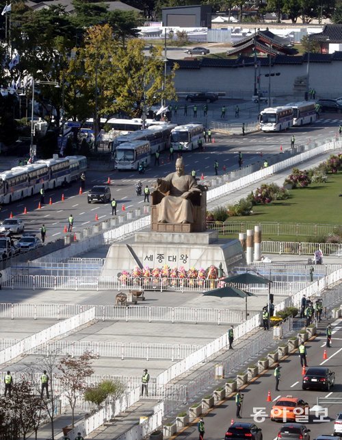 한글날인 9일 서울 종로구 광화문광장 일대에 경찰이 차벽 등을 설치하고 집회와 차량시위가 강행될 상황에 대비해 곳곳을 통제하고 있다.