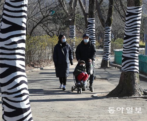서울대공원이 8일 코로나19 사태 장기화로 지쳐 있는 시민들을 위로하기 위해 나무 등 동물원 곳곳에 기린, 얼룩말 등 동물무늬 옷을 입혔다. 관람객이 얼룩말 옷을 입은 나무 사이를 산책하고 있다.
