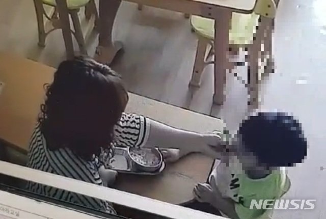 15일 뉴시스가 입수한 경남 사천 K어린이집 폐쇄회로(CC) TV 영상에는 최근 아동학대 등 혐의로 기소된 보육교사 A씨를 제외한 다른 보육교사 및 관계자 등이 장애아동들을 상습적으로 학대한 정황이 담겼다.