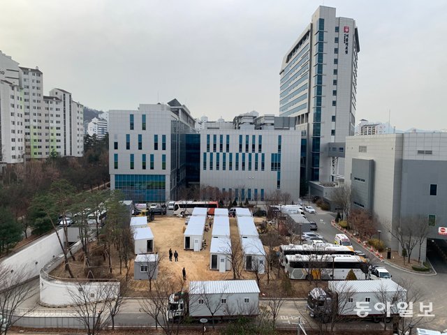 서울시가 컨테이너 임시 병상을 설치해 신종 코로나바이러스 감염증 병상 부족에 대응하겠다는 방침을 밝힌 가운데 9일 서울 중랑구 신내동 서울의료원에서 설치 작업이 진행되고 있다. 송은석 기자 silverstone@donga.com