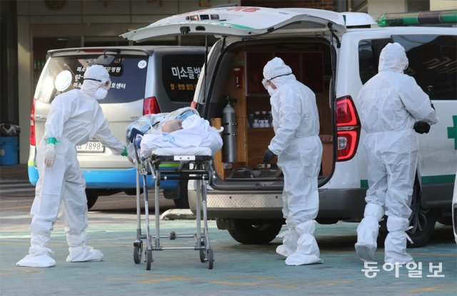 지난해 12월 31일 서울 구로구의 한 요양병원에서 의료진이 코로나19 확진 환자를 다른 병원으로 옮기고 있다.