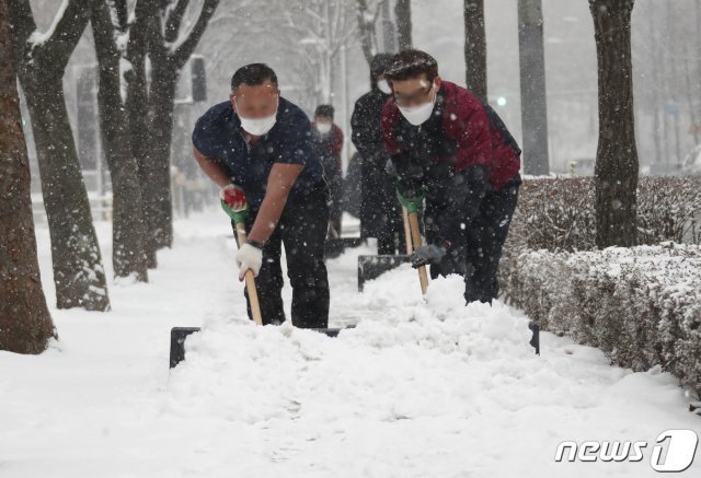 수도권 지역에 함박눈이 내린 12일 오후 서울 양천구 목동 SBS에서 관계자들이 눈을 치우고 있다. 2021.1.12/뉴스1 © News1