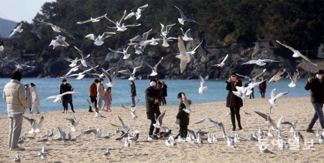 17일 부산 해운대해수욕장에서 갈매기들이 과자를 주는 관광객 주변으로 모여들고 있다. 기상청은 부산 전 지역이 구름이 많다가 낮부터 맑아지고 아침 최저기온 영하 3도, 낮 최고기온 4도로 예보했다.