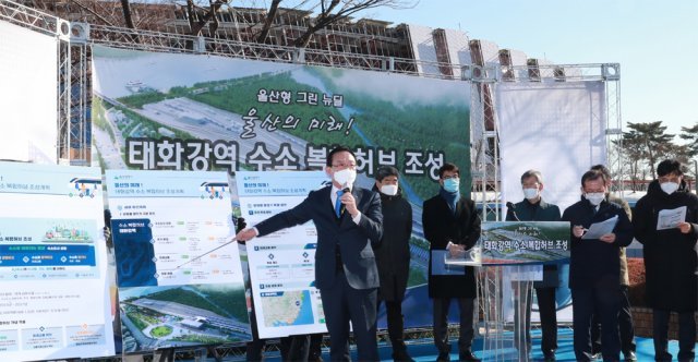 울산 태화강역이 수소산업 전진기지 역할을 할 수소 복합허브로 2027년까지 조성된다. 사진은 송철호 울산시장이 19일 태화강역에서 수소 복합허브 조성계획을 발표하는 모습. 울산시 제공