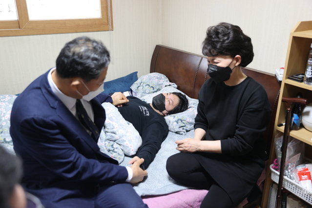 황기철 보훈처장이 10일 천안함 폭침도발의 생존자인 신은총 예비역 하사의 집을 찾아 위로의 뜻을 전하고 있다