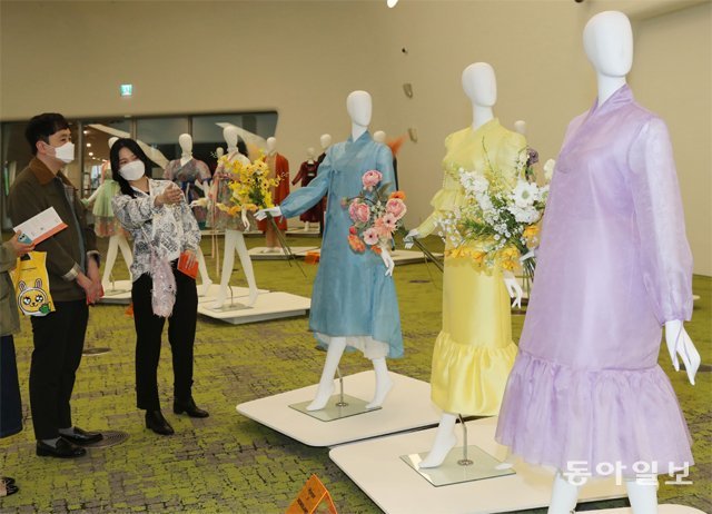 서울 중구 동대문디자인플라자(DDP)에서 열린 ‘케이팝×한복 전시’를 보러 온 시민들이 실제 한류 연예인들이 무대 등에서 입었던 한복 의상을 살펴보고 있다. 13일부터 25일까지 열리는 전시에서는 방탄소년단 등 한류 스타들이 뮤직비디오나 무대 의상으로 입었던 한복 25벌이 전시된다.