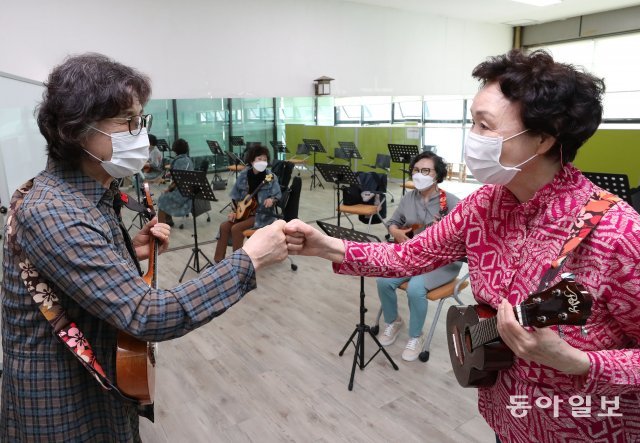 1일 서울 서초구 방배노인종합복지관에서 어르신들이 우쿨렐레 수업에 참여해 인사를 나누고있다. 보건복지부 중앙사고수습본부는 코로나19 백신 접종자를 대상으로 1일부터 노인복지관, 경로당, 주민센터의 프로그램이 코로나사태 이전과 같이 순차적으로 정상화 하기로 했다. 특히, 예방접종 완료자는 노래교실 뿐 아니라 음식 섭취도 가능하게 될 예정이다.