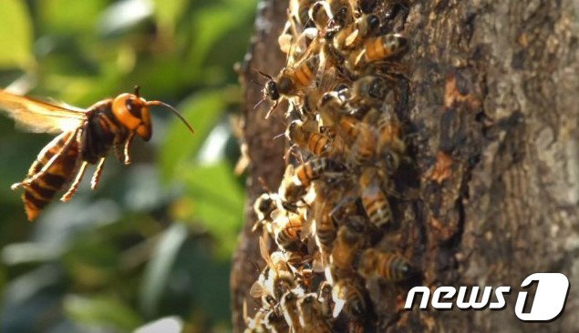 꿀벌을 주위를 날고 있는 말벌.(여수소방서 제공)/뉴스1 © News1