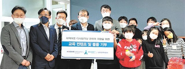 중소벤처기업진흥공단과 아라소프트㈜는 2일 경남 고성군의 선한이웃 지역아동센터에 디지털러닝 인프라를 지원하는 행사를 열고 어린이들과 기념촬영을 하고 있다. 중소벤처기업진흥공단 제공