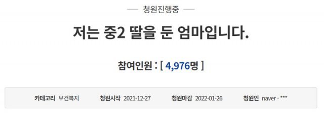 지난 27일, 청와대 국민청원 게시판에 ‘저는 중2 딸을 둔 엄마입니다’라는 제목으로 올라온 청원에 따르면 청원인 A씨는 딸 B양이 지난 17일 코로나 백신 1차 접종을 마쳤다고 밝혔다.