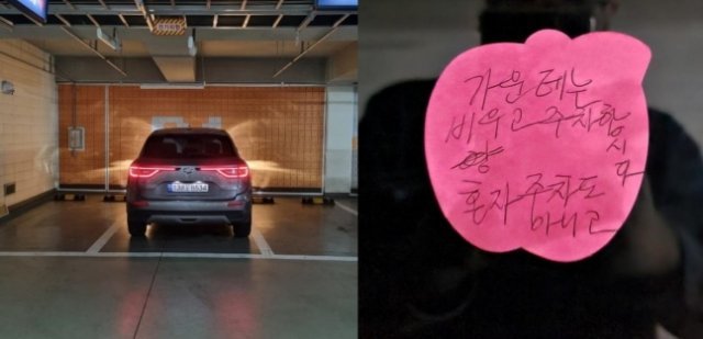 사진에 따르면, 그는 차 3대가 들어가는 주차 칸 중 가운데 자리에 주차했다가 “가운데는 비우고 주차합시다. 혼자 주차도 아니고”라고 적힌 비난 쪽지를 받았다.