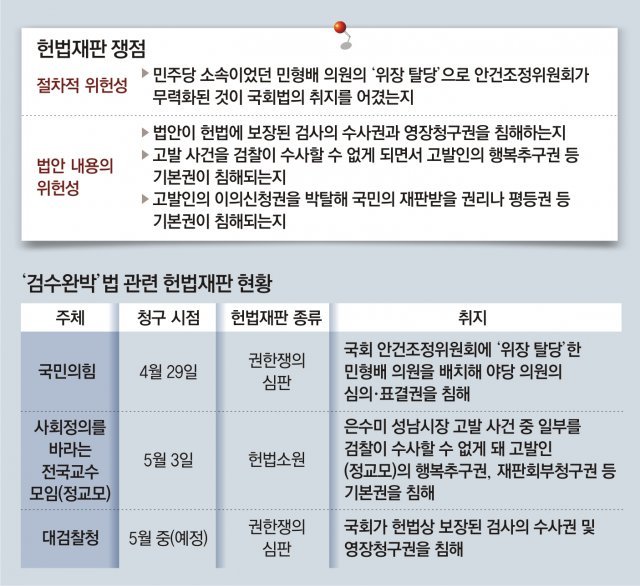 검수완박 법안과 관련해 이날까지 헌재에는 헌법소원 5건과 권한쟁의심판 1건이 접수됐다. 국민의힘은 지난달 29일 법안의 심의·표결권을 침해했다는 이유로 권한쟁의심판을 청구해 헌재에서 심리가 진행 중이다. 시민단체 ‘사회 정의를 바라는 전국 교수 모임’(정교모)도 자신들이 고발한 사건 중 일부에 대해 검찰이 수사할 수 없게 되면서 행복추구권 등 기본권이 침해됐다며 3일 헌재에 헌법소원을 제기했다.