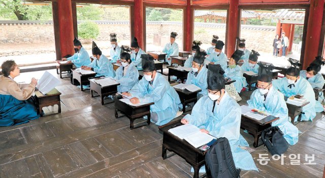 우리나라 최초의 서원인 경북 영주시 소수서원 강학당에서 7일 개강한 ‘사마(司馬)선비 양성과정’ 참가자들이 의관을 갖춰 입고 학습을 하고 있다. 동양대와 소수서원이 개설한 이 과정은 주 1회 소학과 사서오경, 주자서 등 유가 경전을 중심으로 강의가 진행된다. 사마는 고려, 조선시대 때 생원과 진사를 선발하던 과거시험이다.