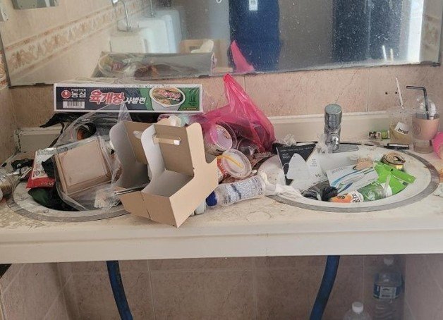 작성자가 공개한 사진에는 화장실 세면대에 물을 틀 수 없을 정도로 쓰레기가 가득 차있거나, 변기에는 오물과 토사물이 가득 차 있었다.