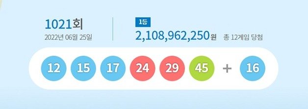 25일 추첨한 제1021회 로또 1등 당첨번호는 ‘12.15.17.24.29.45’로 결정됐다. 보너스 번호는 ‘16’이다.
