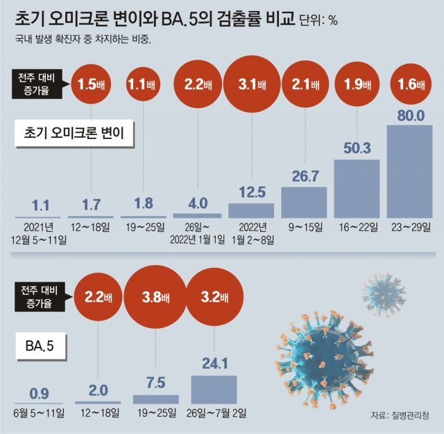 이번 코로나19 유행을 주도하는 건 오미크론 변이의 세부 계통인 ‘BA.5’다. 질병청이 코로나19 확진자의 바이러스를 분석한 결과 6월 둘째 주(5∼11일) BA.5의 비율이 0.9%에 불과했는데 지난주(6월 26일∼7월 2일)엔 24.1%로 늘었다. 이 속도면 이번 주 50%를 넘어 우세종이 될 것으로 보인다. 오미크론 변이보다 확산 속도가 더 빠르다.