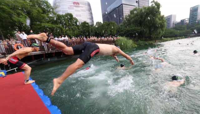 7일 오전 서울 송파구 롯데월드타워 일대에서 열린 아쿠아슬론 대회인 Oe RACE에 출전한 참가자들이 석촌호수에 입수하고 있다. 사진공동취재단