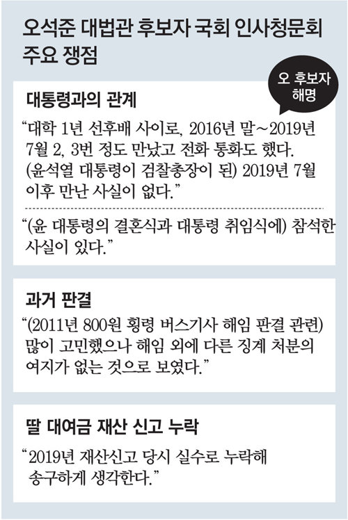 28일 오 후보자가 국회에 제출한 서면답변에 따르면 오 후보자는 “(윤 대통령과) 대학교 1년 선후배 사이라 학교 다닐 때 알고 지낸 사이”라면서도 “재학 당시 함께 사법시험을 준비했다거나 스터디 모임, 사적 모임 등을 같이한 바 없다”고 밝혔다. “유달리 친분이 있지는 않다”고도 했다.