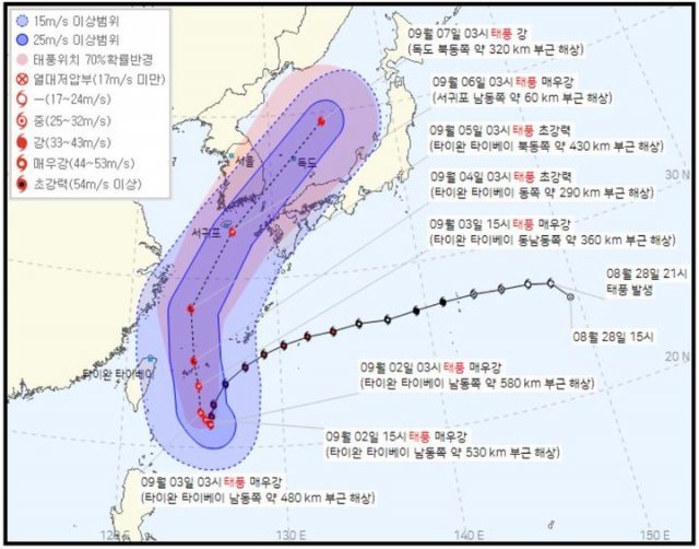 6일쯤 제주를 통과해 부산을 중심으로 한반도를 지나갈 것으로 관측된다. 이때 예상 중심기압은 945hPa, 최대 풍속은 초속 45m 수준으로 사람이나 커다란 돌이 비바람에 날아갈 수 있을 정도의 세기인 ‘매우 강’ 강도다.