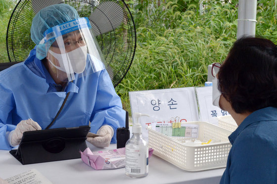 민족대명절 추석 당일인 10일 오후 광주 서구 치평동 5·18교육관 주차장에 마련된 임시 선별진료소에서 의료진이 시민에게 코로나19 검사 안내를 하고 있다. 2022.9.10/뉴스1