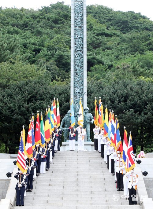 15일 인천 연수구 인천상륙작전기념관에서 열린 72주년 인천상륙작전 전승행사에서 해군 장병들이 6·25전쟁 참전국 국기를 들고 도열해 있다. 인천시와 해군본부가 공동 개최하는 전승행사는 2019년 태풍 링링과 신종 코로나바이러스 감염증 확산 등의 여파로 4년 만에 열렸다.