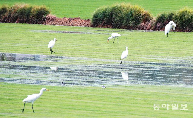 한 무리의 백로가 19일 전남 장성군 삼계면 잔디 재배 농장을 찾았다. 백로들이 잔디밭을 오가며 먹이를 찾고 있다.