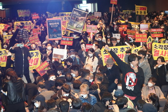 18일 오후 서울 마포구 누리꿈스퀘에서 열린 ‘상암동 광역자원회수시설 후보지선정 주민설명회’에서 소각장 신설 계획 철회를 요구하는 주민들이 시 관계자들과 충돌하고 있다. 2022.10.18/뉴스1
