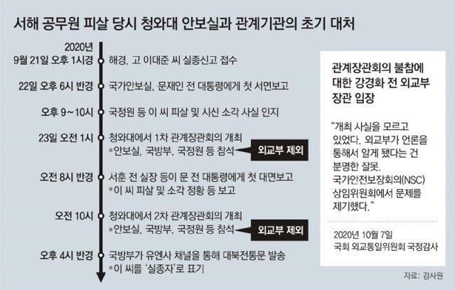 11일 동아일보 취재를 종합하면 서울중앙지검 공공수사1부(부장검사 이희동)는 9일 서 전 실장을 허위 공문서 작성 및 행사 등의 혐의로 기소하며 “피살 사실을 은폐할 목적으로 피살 다음 날(2020년 9월 23일) 청와대에서 열린 관계장관회의에서 참석 대상자였던 강 전 장관을 의도적으로 배제했다”는 취지의 내용을 배경사실로 적시했다. 서 전 실장은 당시 회의록을 남기지 않을 목적으로 A 안보전략비서관 또한 회의에 참석하지 못하게 한 것으로 전해졌다.