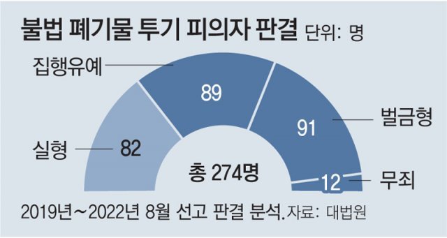 폐기물을 불법 투기하면 폐기물관리법에 따라 5년 이하의 징역 또는 5000만 원 이하의 벌금 등에 처해진다. 그러나 동아일보 취재팀이 대법원 판결문 검색 시스템을 통해 2019년 1월∼2022년 8월 폐기물관리법 해당 조항 위반 사건 91건을 분석한 결과 피고인 274명 중 실형을 선고받은 이는 82명(29.9%)에 불과했다. 소수의 무죄(12명·4.4%)를 제외한 대부분은 집행유예(89명·32.5%)나 벌금형(91명·33.2%)에 처해졌다.