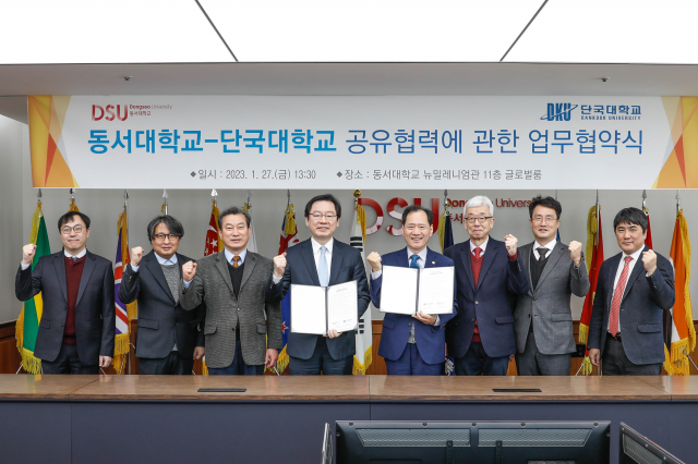 단국대는 27일 오후 부산 동서대 뉴밀레니엄관 11층 글로벌 룸에서 동서대와 공유협력에 관한 업무 협약을 체결했다. 이 자리에는 김수복 단국대 총장과 장제국 동서대 총장 등 두 대학 경영진이 참석했다.
