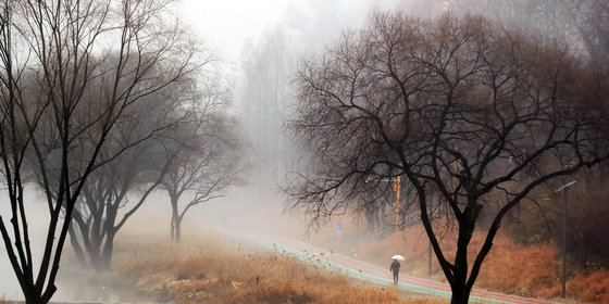 겨울비가 내리고 소강상태를 보인 13일 오후 서울 서초구 양재천에 안개가 짙게 끼어있다. 2023.1.13. 뉴스1