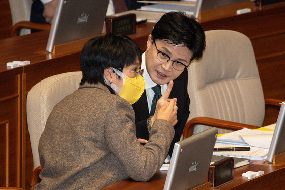 장혜영 정의당 의원(왼쪽)과 한동훈 법무부 장관이 8일 서울 여의도 국회에서 열린 제403회 국회(임시회) 제4차 본회의에서 대화하고 있다. 2023.2.8. 뉴스1